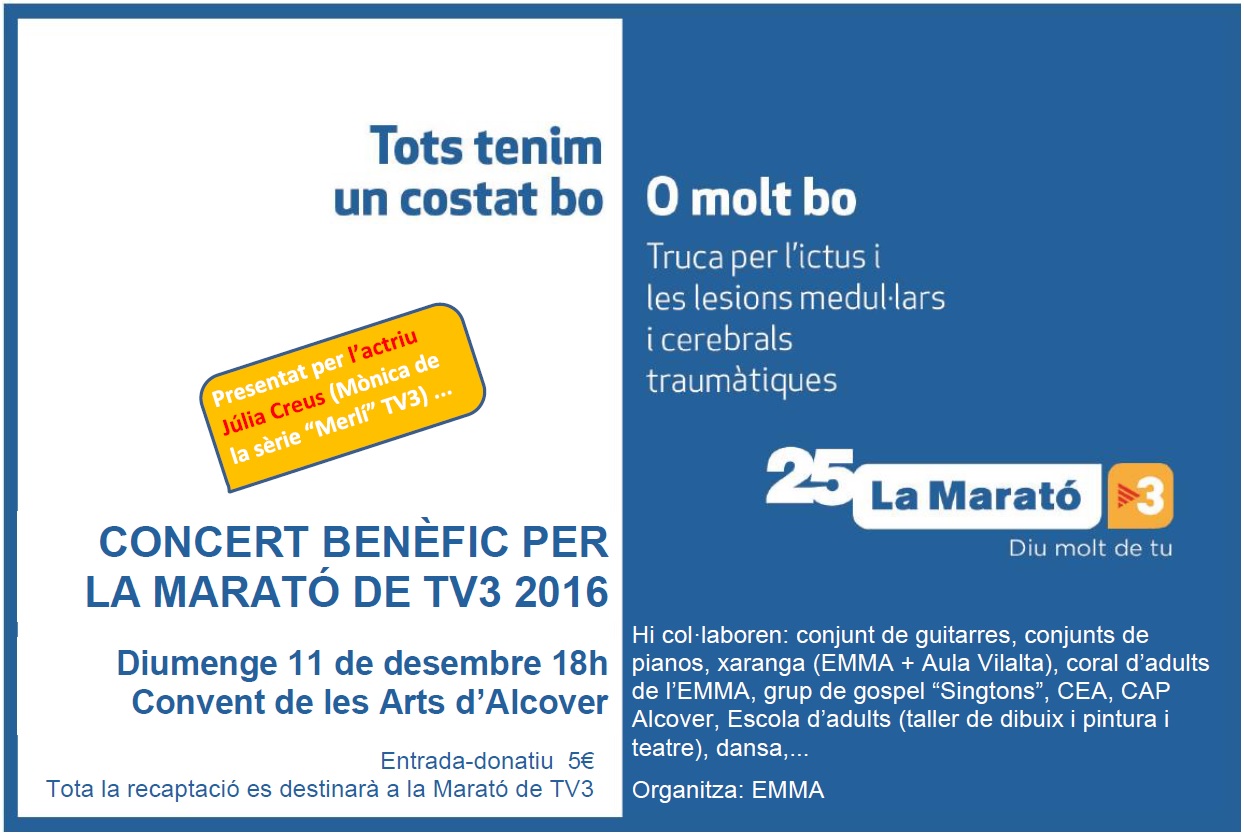 El proper diumenge 11 de desembre a les 6 de la tarda, l’EMMA organitzarà una nova edició del Concert Benèfic per la Marató de TV3! Presentat per Júlia Creus (Mònica de la sèrie “Merlí” de TV3″) i amb més de 100 artistes convidats!